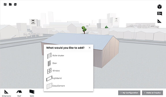 Easily add roller shutters, sectional doors, sliding doors, or rapid-action doors via drag and drop. Enhance your building with doors, windows, and extras such as wall light bands or glass elements for added comfort and tailored utility.