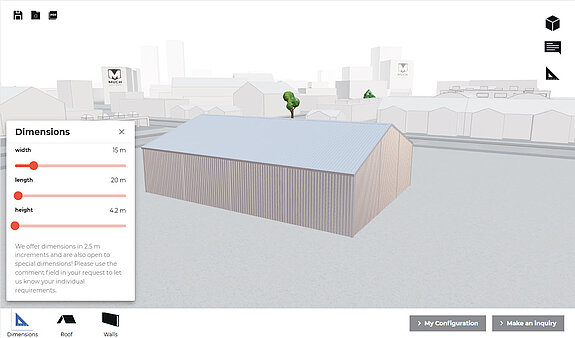 Design your metal building exactly as you need it! Our 3D designer allows you to quickly and easily define the exact specifications for your building – from dimensions to customised features. You can effortlessly choose the shape, roof covering, and wall cladding. Start your project immediately without registration and create your perfect building in 3D with the MUCH Metal Building Designer.