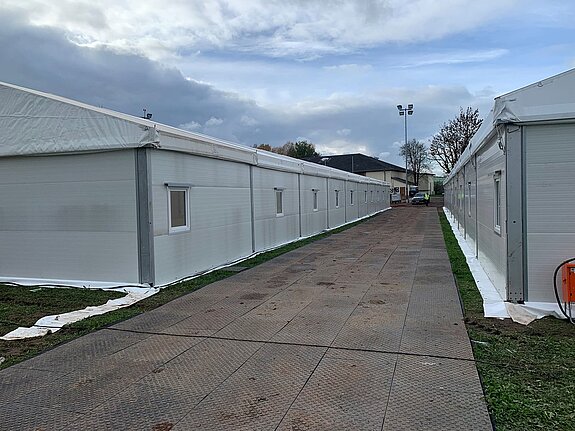 Our combined package for the emergency shelter in Friedberg consists of a hall, partition walls for privacy, sanitary facilities, and heating.